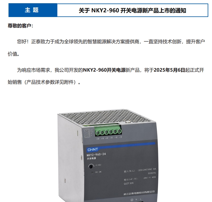 關(guān)于 NKY2-960 開(kāi)關(guān)電源新產(chǎn)品上市的通知