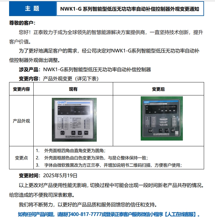 NWK1-G 系列智能型低壓無功功率自動(dòng)補(bǔ)償控制器外觀變更通知