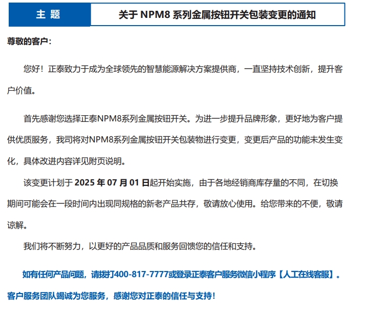 關(guān)于 NPM8 系列金屬按鈕開關(guān)包裝變更的通知