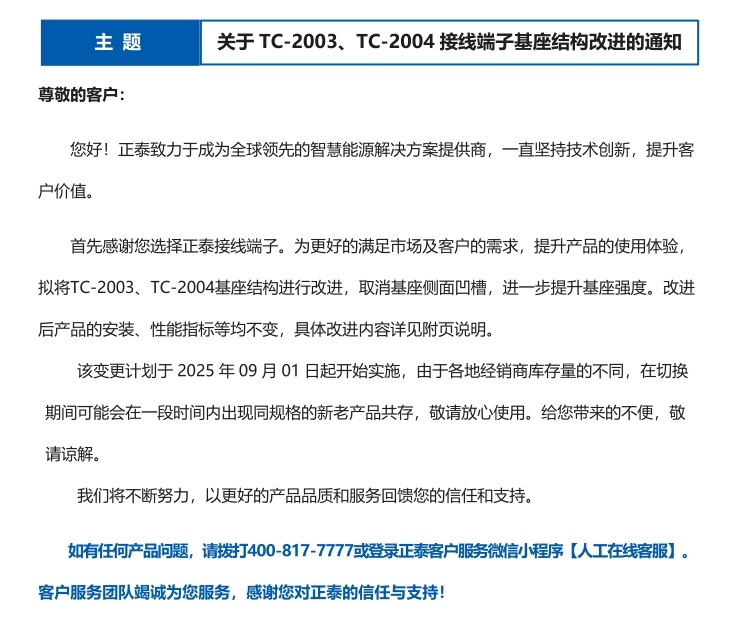 關(guān)于 TC-2003、TC-2004 接線端子基座結(jié)構(gòu)改進的通知