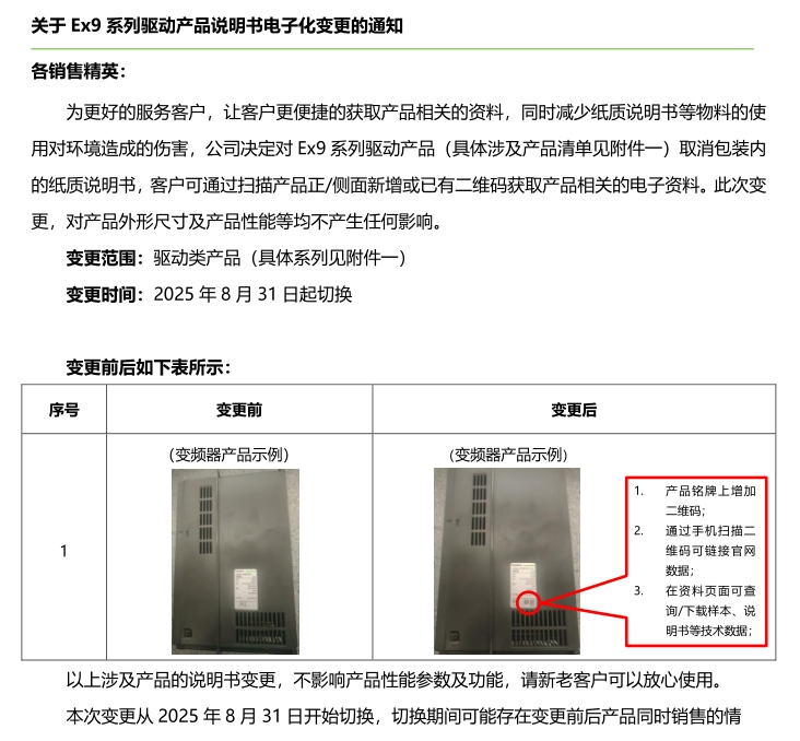 關(guān)于 Ex9 系列驅(qū)動產(chǎn)品說明書電子化變更的通知
