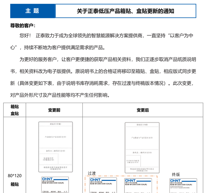 關(guān)于正泰低壓產(chǎn)品箱貼、盒貼更新的通知