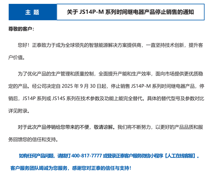 關(guān)于 JS14P-M 系列時(shí)間繼電器產(chǎn)品停止銷售的通知